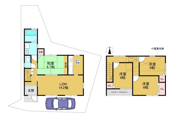 階数 区分 広さ 1F LDK 14.2帖 1F 和 6.7帖 2F 洋 6.0帖 2F 洋 6.0帖 2F 洋 6.0帖 - 駐車場
