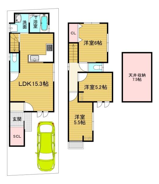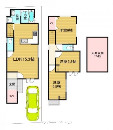 階数 区分 広さ 1F LDK 15.3帖 2F 洋 6.0帖 2F 洋 5.5帖 2F 洋 5.2帖 - 駐車場