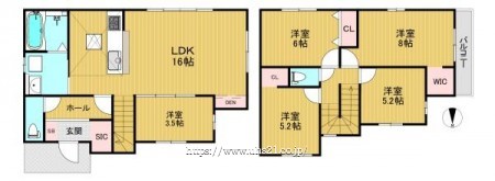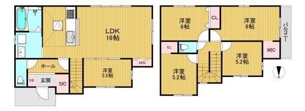 階数 区分 広さ 1F LDK 16.0帖 1F 洋 3.5帖 2F 洋 8.0帖 2F 洋 6.0帖 2F 洋 5.2帖 2F 洋 5.2帖 - 駐車場