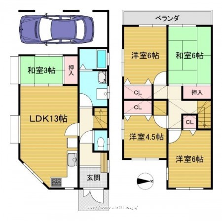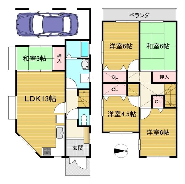階数 区分 広さ 1F LDK 13.0帖 1F 和 3.0帖 2F 和 6.0帖 2F 洋 6.0帖 2F 洋 6.0帖 2F 洋 4.5帖 - 駐車場