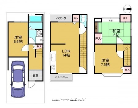 階数 区分 広さ 1F 洋 6.6帖 2F LDK 14.0帖 3F 洋 7.5帖 3F 和 6.0帖 - 駐車場