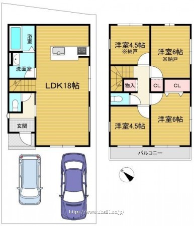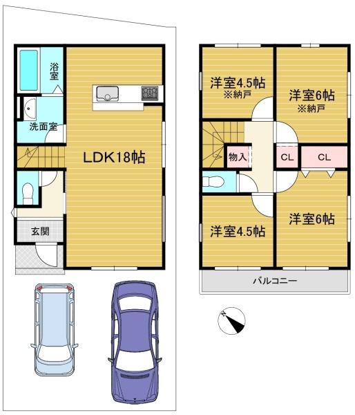 階数 区分 広さ 1F LDK 18.0帖 2F 洋 6.0帖 2F S 6.0帖 2F 洋 4.5帖 2F S 4.5帖 - 駐車場