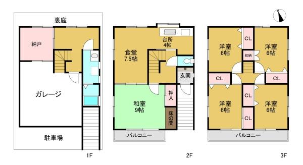 階数 区分 広さ 1F S 4.5帖 2F LDK 20.5帖 3F 洋 6.0帖 3F 洋 6.0帖 3F 洋 6.0帖 3F 洋 6.0帖 - 駐車場