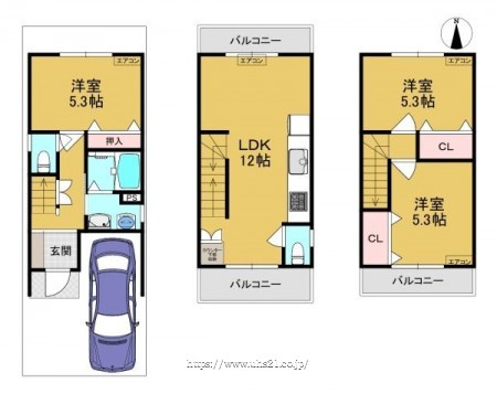 階数 区分 広さ 1F 洋 5.3帖 2F LDK 12.0帖 3F 洋 5.3帖 3F 洋 5.3帖 - 駐車場
