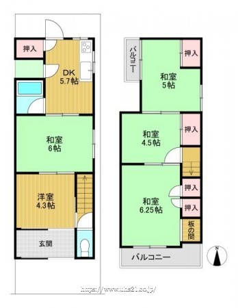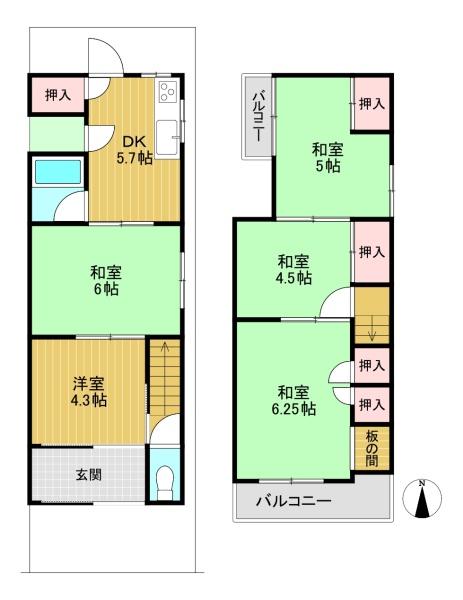 階数 区分 広さ 1F 和 6.0帖 1F DK 5.7帖 1F 洋 4.3帖 2F 和 6.3帖 2F 和 5.0帖 2F 和 4.5帖 - 駐車場