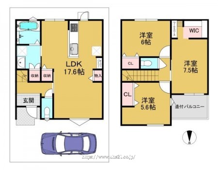 階数 区分 広さ 1F LDK 17.6帖 2F 洋 7.5帖 2F 洋 6.0帖 2F 洋 5.6帖 - 駐車場