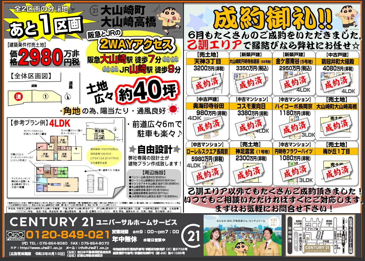 WEBチラシ詳細 2021年07月09日公開 大山崎町/あと1区画! クリックすると、大きな画像でご覧いただけます。 このチラシの関連物件一覧 ********** ***万円 ****** ****** オススメ